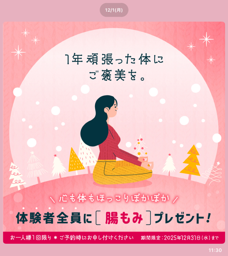 1年頑張った体にご褒美を。12月は「心も体もほっこりぽかぽか」体験❣